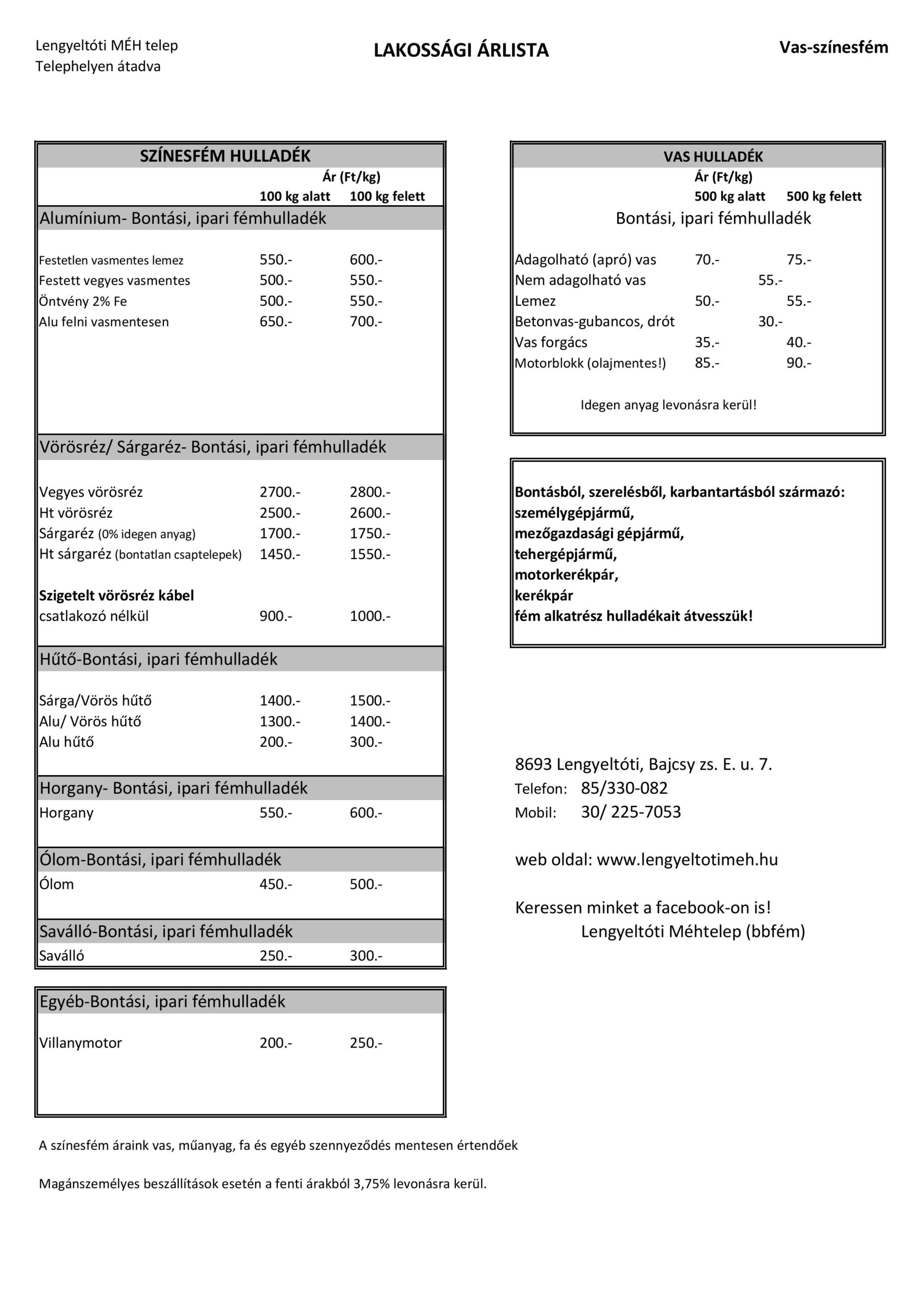 A szennyeződések levonásra kerülnek. Az árak tájékoztató jellegűek. Az árváltozás jogát fenntartjuk!